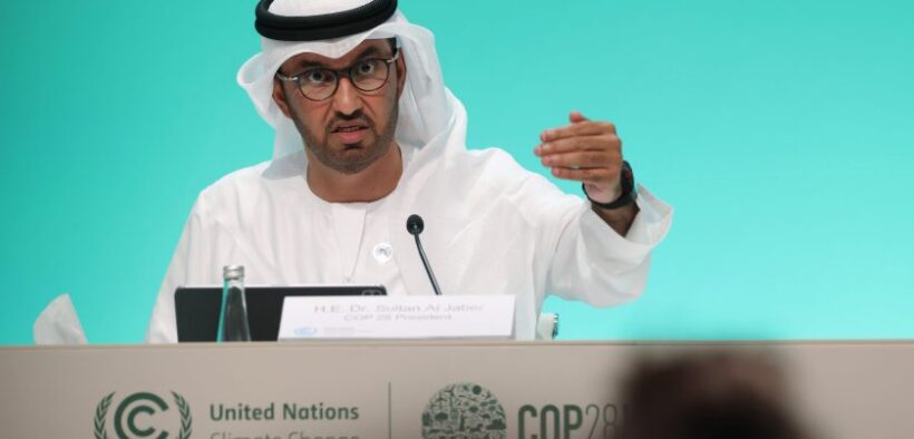 Sultan Ahmed Al Jaber, president of the UNFCCC COP28 Climate Conference, speaks following the opening session of the conference on Nov. 30, 2023 in Dubai. Sean Gallup—Getty Images